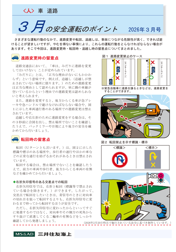 2026年3月の安全運転のポイントは「進路変更・転回・追越」です。